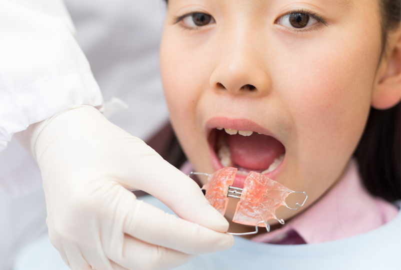 小児矯正治療では、お子さま専用の矯正装置を用いて、顎の成長を利用しながら歯が並ぶスペースを確保します。大人の矯正治療のように、歯を無理に動かす処置は基本的に行わないため、少ない負担で歯並びを整えられます。小児矯正治療にご興味があるかたは、当院スタッフまでお気軽にご相談ください。
